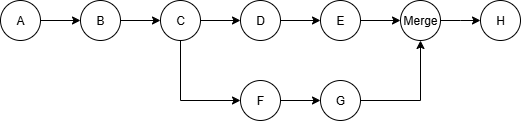这时候我们在main分支上,并试图将E和G合并在一起。这时,会自动创建一个特殊的提交Merge,它有两个父提交。之后的提交就会以Merge为父提交,而不是E或G中的任何一个。