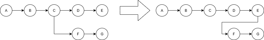 如果我们已经在feature分支上进行了多次提交F、G,同时在main分支上也有了新的提交D、E。现在想要将feature这些提交变基到main分支上,可以使用以下命令: